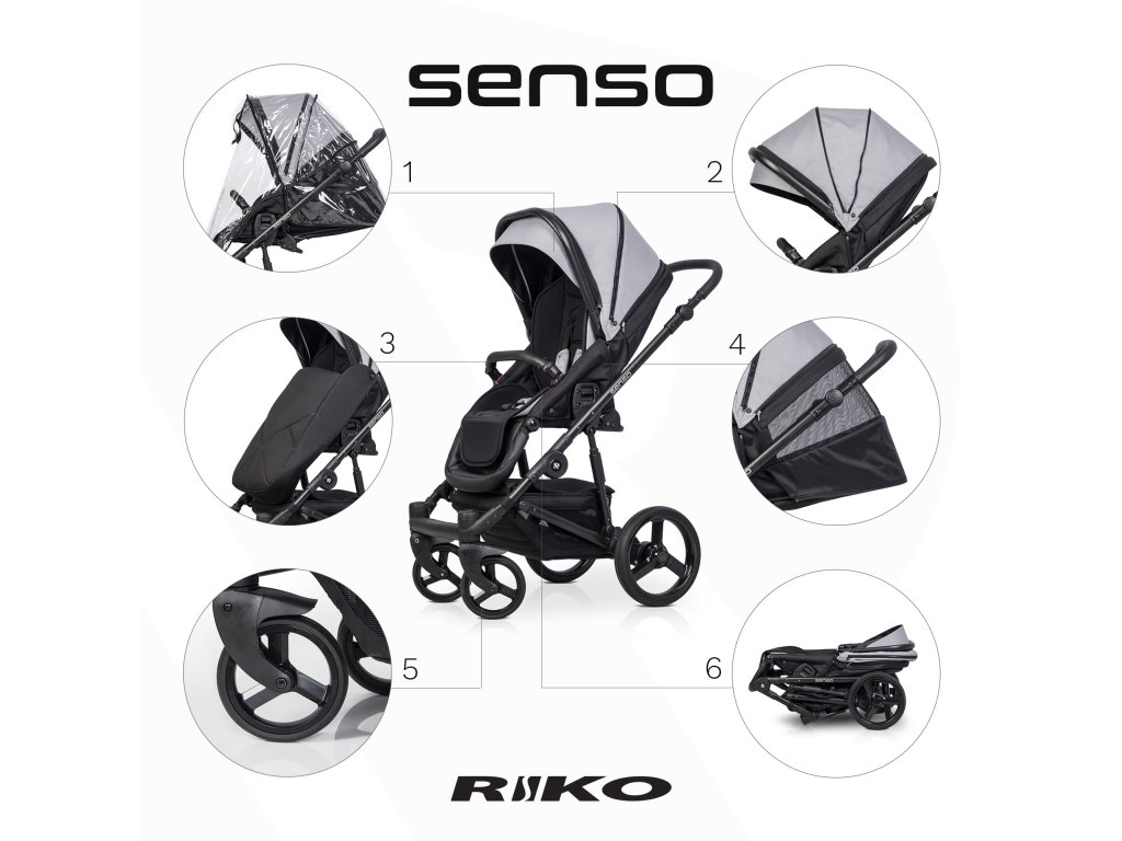 Kočárek Senso 2v1 vyniká z řady kočárků RIKO kompaktnějšími rozměry a naplocho skládací gondolou. Díky použití o něco menších předních kol se kočárek Senso skládá na menší velikost a je velmi dobře vyvážený (přední náprava je perfektně zatížena, což usnadňuje zatáčení).