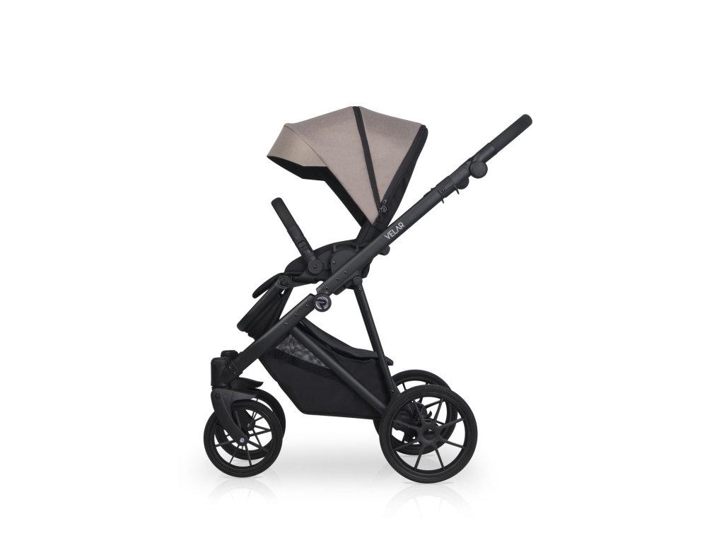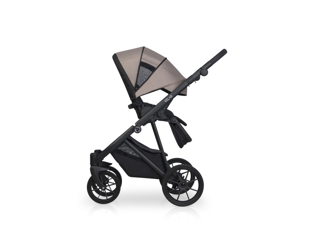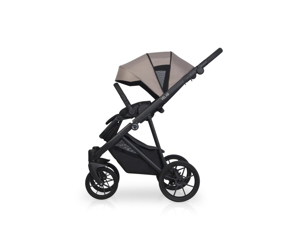 Rám kočárku Velar je vyroben z lehkého hliníku, díky čemuž je celá konstrukce velmi lehká. Funkčnost rámu byla navíc rozšířena o velký nákupní košík, módní tašku, hrnek a nastavitelnou rukojeť. Zadní odpružení kočárku má výborné tlumení nárazů, polyuretanová kola s ložisky a možnost nastavení tvrdosti odpružení zajišťuje pohodlnou jízdu. Uzamykatelná přední kolečka zase zajišťují maximální plynulost řízení. Pro optimální bezpečnost je kočárek vybaven parkovací brzdou.